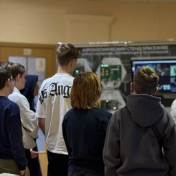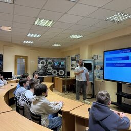 Николай Иванович Синёв, старший преподаватель Института аэрокосмических приборов и систем, провёл для ребят экскурсию по Центру аэрокосмических исследований и разработок (Aerospace R& D Center), который функционирует на базе кафедры аэрокосмических компьютерных и программных систем Института. Николай Иванович рассказал школьникам о перспективных проектах и возможностях для студентов.