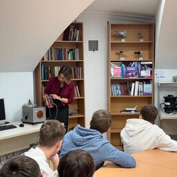 Затем Михаил Евгеньевич Иванов и Валентина Павловна Барякшева, ассистенты Института аэрокосмических приборов и систем, показали обучающимся лабораторию аэрокосмической микромеханики и рассказали про оборудование, необходимое для изучения принципов построения, проектирования и изготовления микромеханических гироскопов и акселерометров, которые применяются для измерения движений.