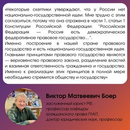 Именно построение в нашей стране правового государства и есть национально-государственная идея. Главными принципами правового государства являются — верховенство правового закона, разделение властей и взаимная ответственность гражданина и государства. Именно к реализации этих принципов в полной мере необходимо стремится обществу и государству»