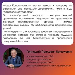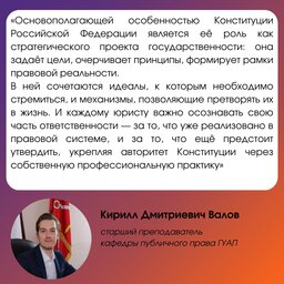 «Основополагающей особенностью Конституции Российской Федерации является её роль как стратегического проекта государственности: она задаёт цели, очерчивает принципы, формирует рамки правовой реальности. В ней сочетаются идеалы, к которым необходимо стремиться, и механизмы, позволяющие претворять их в жизнь. И каждому юристу важно осознавать свою часть ответственности — за то, что уже реализовано в правовой системе, и за то, что ещё предстоит утвердить, укрепляя авторитет Конституции через собственную профессиональную практику»
