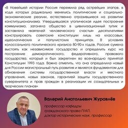 «В Новейшей истории Россия пережила ряд острейших этапов, в ходе которых радикально менялись политические и социально-экономические реалии, естественно отразившиеся на развитии конституционализма. Утвердившаяся утопическая идея построения коммунизма, загоняла общество в цивилизационный тупик и заставляла „ваятелей человеческого счастья“ десятилетиями конструировать советские конституции лишь на классовых, идеологических и популистских принципах. В условиях колоссального политического кризиса 80-90-х годов, Россия сумела выстоять как независимое государство и определить курс на построение демократического, федеративного, правового государства, который и был закреплен во всенародно принятой Конституции 1993 года. Важно отметить, что она определила новый для России магистральный путь развития и является фундаментом для обновления системы государственной власти и местного управления, новых законов, гарантией защиты государственного суверенитета и прав граждан в реализации их созидательных и творческих планов»