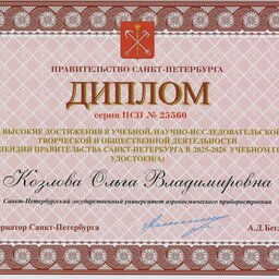 Студентка 4 курса, специальности 12.02.01 «Авиационные приборы и комплексы» факультета СПО ГУАП Козлова Ольга за высокие достижения в учебной, научно-исследовательской, творческой и общественной деятельности удостоена звания лауреата стипендии правительства Санкт-Петербурга в 2025-2026 учебном году.