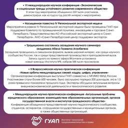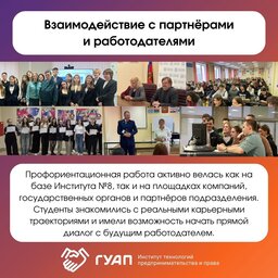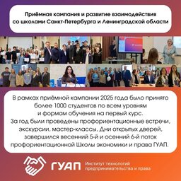 За год были проведены профориентационные встречи, экскурсии, мастер-классы, Дни открытых дверей, завершился весенний 5-й и осенний 6-й поток профориентационной Школы экономики и права ГУАП.
