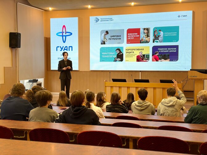 Презентацию для них провёл Бакурин Ростислав, амбассадор ГУАП, студент первого курса Факультета среднего профессионального образования.