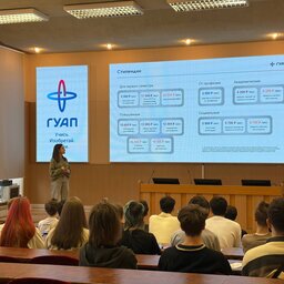 Для ребят была организована презентация ГУАП, которую провела заместитель директора Центра организации приёма Великородная Анна Ивановна. В ходе презентации школьники познакомились с направлениями подготовки, особенностями приёмной кампании и возможностями обучения в университете.