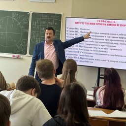 Кульминацией встречи стало интерактивное лекционное занятие на тему «Квалификация ст. 105 УК РФ». С лекцией перед школьниками выступил Олег Витальевич Харченко, канд. юрид. наук, профессор кафедры публичного права.