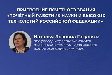 Институт технологий предпринимательства и права ГУАП поздравляет с присвоением почётного звания «Почётный работник науки и высоких технологий Российской Федерации» Наталью Львовну Гагулину, доктора экономических наук, профессора кафедры экономики высокотехнологичных производств!
